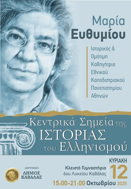 Ο Δήμος Καβάλας, στο πλαίσιο των εκδηλώσεων που διοργανώνει ανά τακτά χρονικά διαστήματα με αντικείμενο την πλούσια ιστορία της χώρας μας και το αποτύπωμα των Ελλήνων στην παγκόσμια κοινότητα, υποδέχεται, για μία ακόμη φορά, την Ιστορικό και Ομότιμη Καθηγήτρια του Εθνικού Καποδιστριακού Πανεπιστημίου Αθηνών, Μαρία Ευθυμίου.