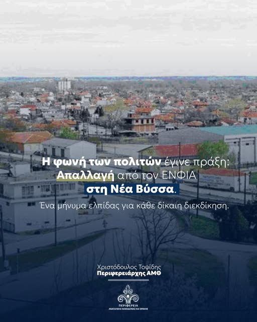Η απόφαση της Κυβέρνησης και του Υπουργείου Οικονομικών για την απαλλαγή των κατοίκων της Νέας Βύσσας από τον ΕΝΦΙΑ αποτελεί δικαίωση. Δεν ήταν αποτέλεσμα ενός τυπικού αιτήματος, αλλά προϊόν συλλογικής προσπάθειας, επιμονής και διεκδίκησης των ίδιων των πολιτών.