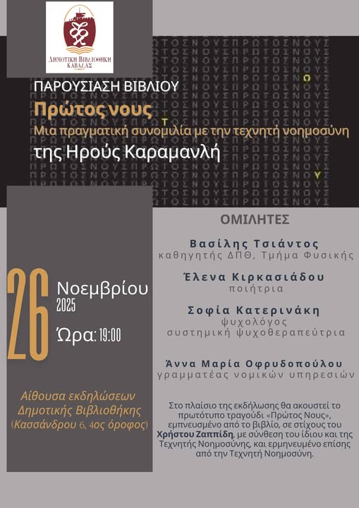 Στο πλαίσιο της εκδήλωσης θα παρουσιαστεί και το πρωτότυπο τραγούδι «Πρώτος Νους», εμπνευσμένο από το βιβλίο, με στίχους του Χρήστου Ζαππίδη και ερμηνεία δημιουργημένη με τη συμβολή της τεχνητής νοημοσύνης.
